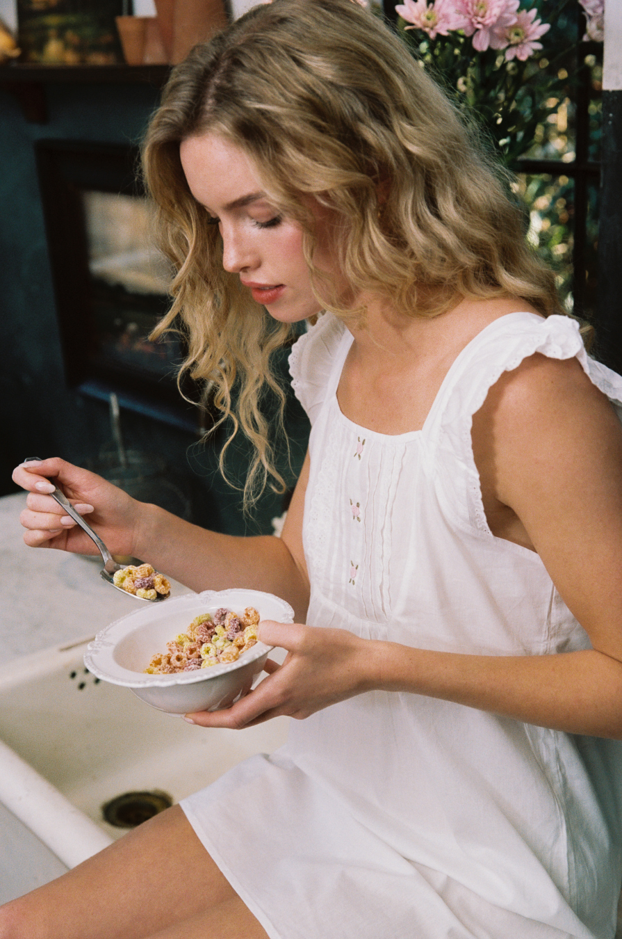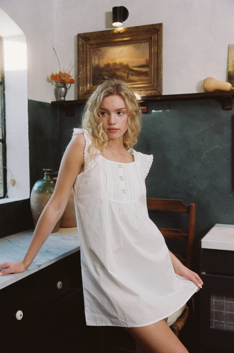 Charming vintage lace sleeves, the perfect length, finished with delicate pink floral embroidery. The Ophelia Vintage Nightie is what vintage dreams are made of. Made from 100% soft & breathable cotton, as always. Ophelia is here to make your nights ( and lazy days ) delightfully special.